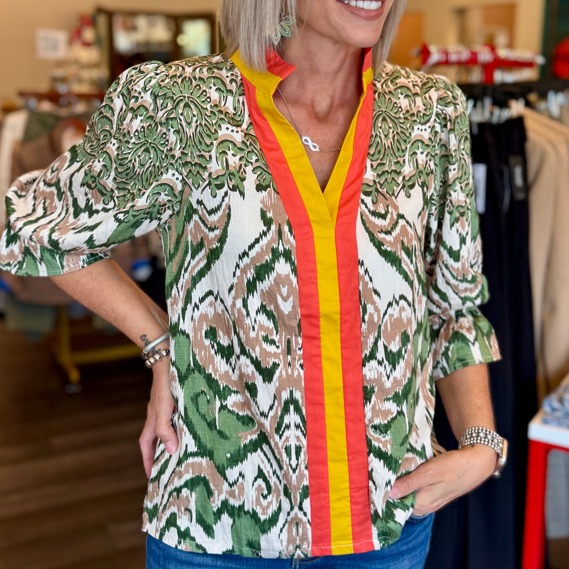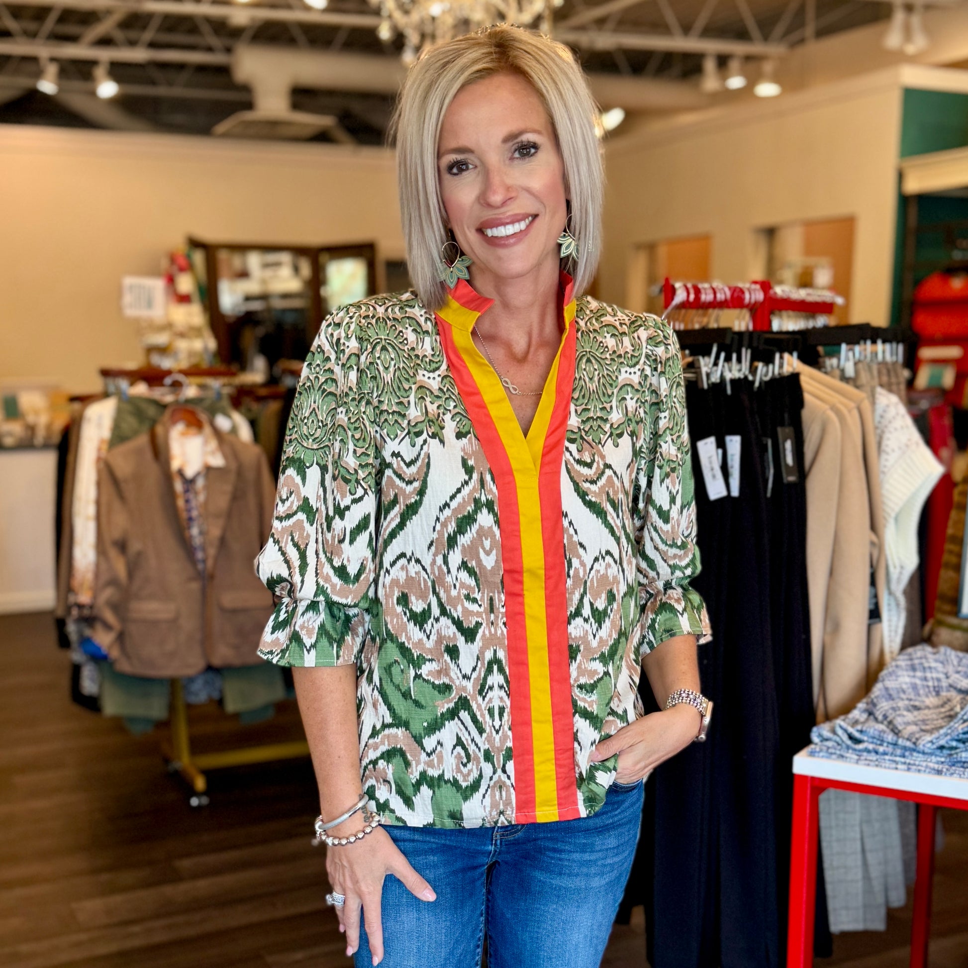 Bring vibrant charm to your fall wardrobe with this Abstract Ikat Stripe Placket top. Featuring a lively green and tan ikat print highlighted by a playful orange and yellow stripe down the front v-neck and collar, it adds a cheerful pop to any outfit. The gathered 3/4 sleeves offer a relaxed, flirty feel while the soft blend of 85% rayon and 15% nylon ensures comfortable all-day wear. Sara’s favorite small fit is ready to brighten your seasonal style with a touch of fun and flair.