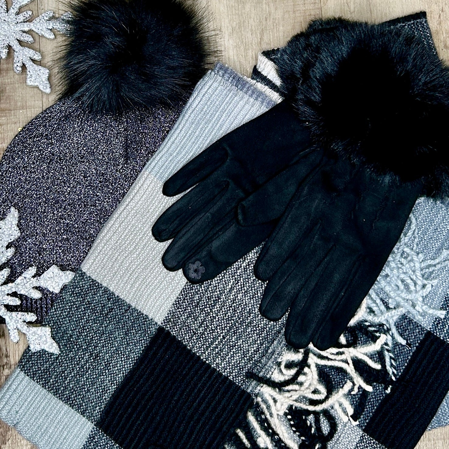 Wrap yourself in timeless elegance with the Black Plaid Phoebe Scarf. This fabulous staple features a sophisticated color palette of black, dark grey, light grey, and ivory in a classic plaid pattern, finished with delicate fringe at the bottom. Perfect for elevating any outfit, it pairs beautifully with black gloves and a matching hat for that polished, put-together vibe. Whether you're heading to brunch or bundling up for a chilly day, this versatile scarf brings effortless style to your wardrobe.