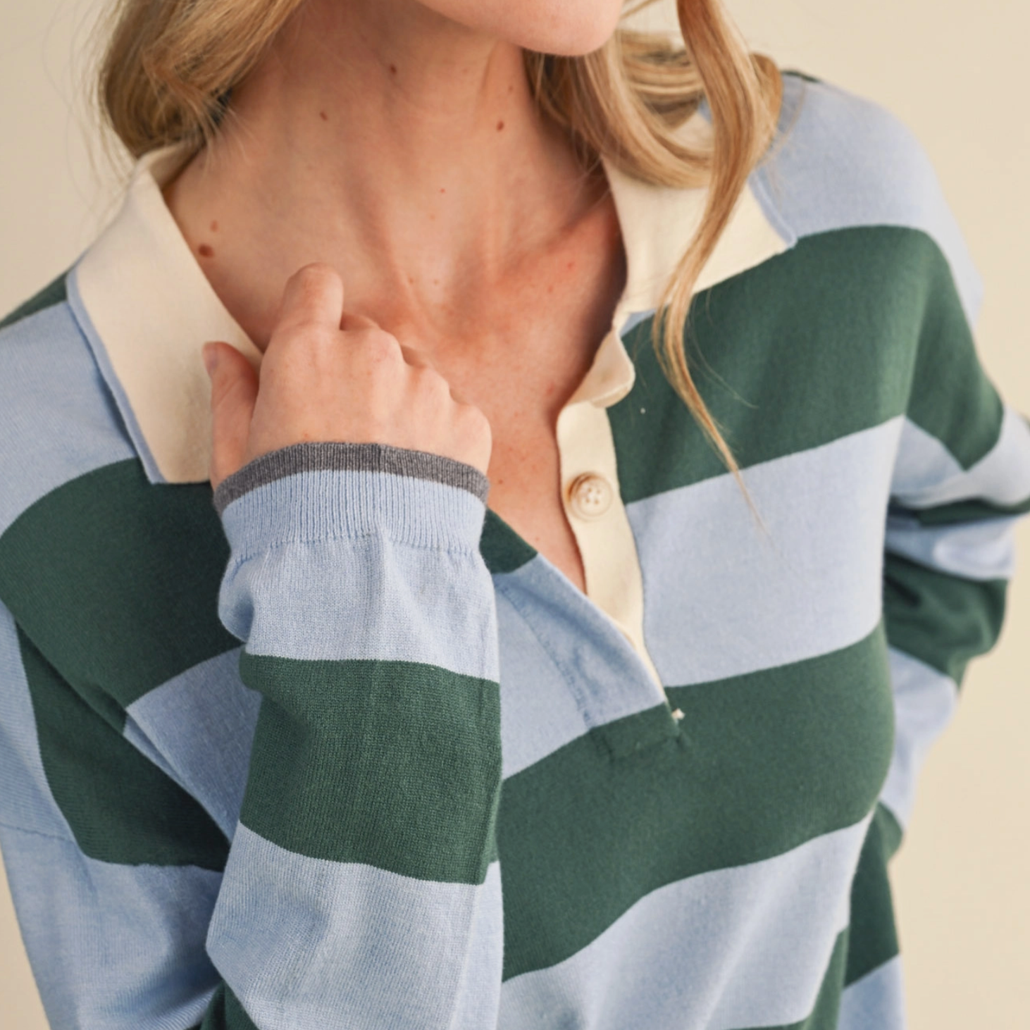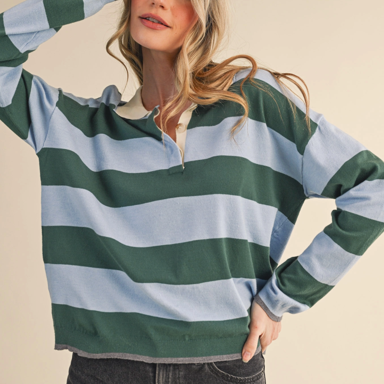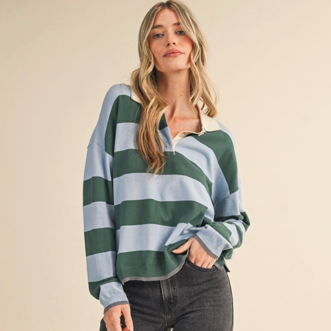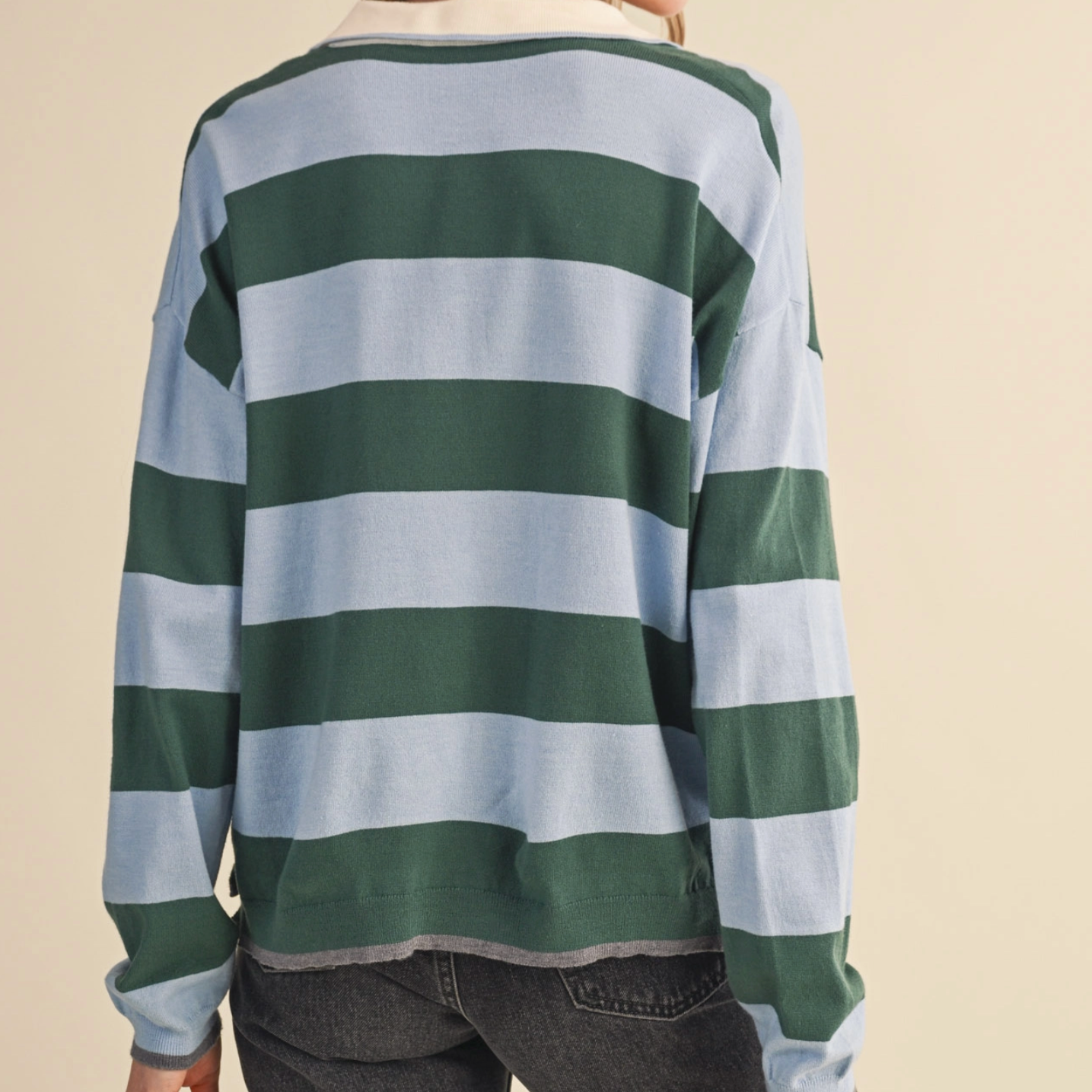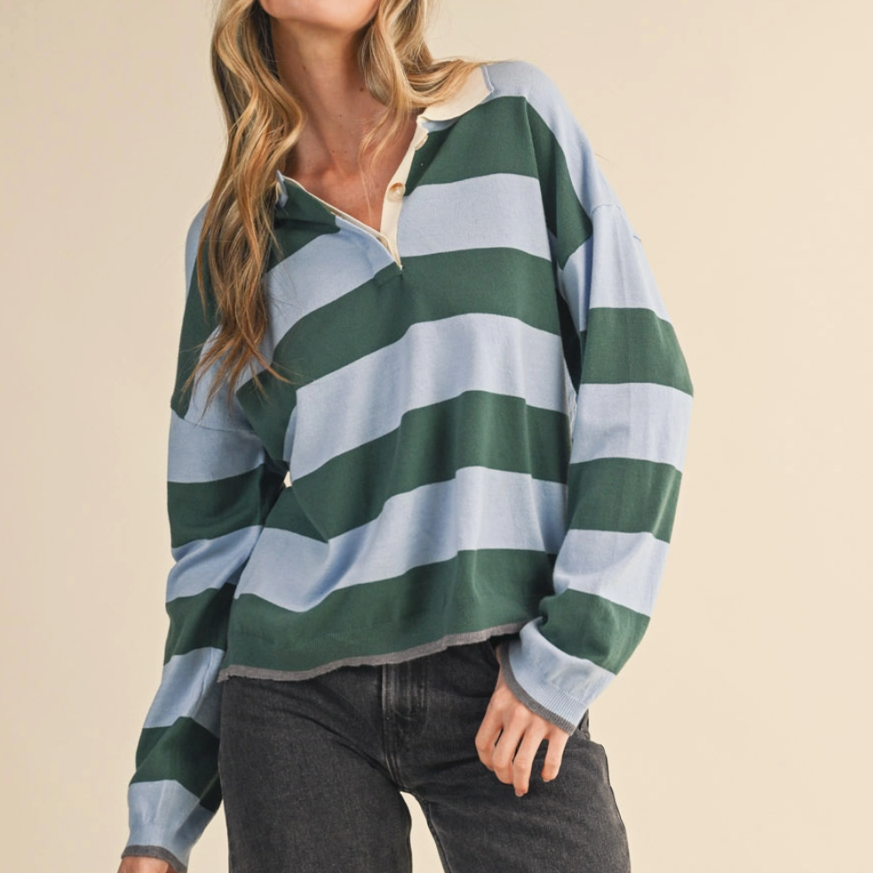 Throw on this boxy rugby sweater for instant laid-back vibes. Featuring bold stripes and a classic collared neckline with button placket, it's got that effortlessly cool factor down pat. The drop shoulder sleeves and slouchy fit make it perfect for layering or wearing solo, while ribbed details at the collar, cuffs, and hem keep everything in place. Whether you're channeling vintage prep or modern casual, this pullover is your new go-to for looking put-together without trying too hard.