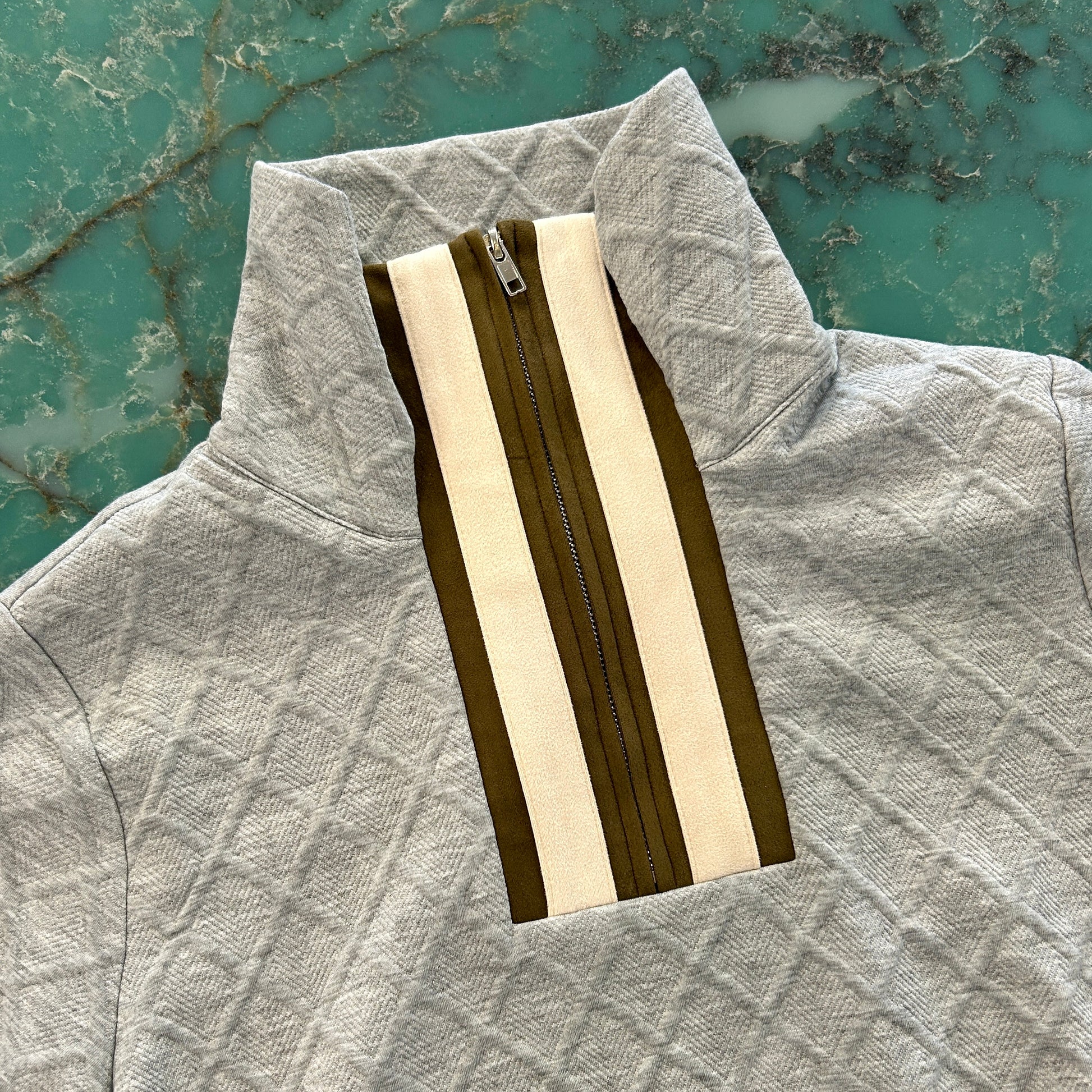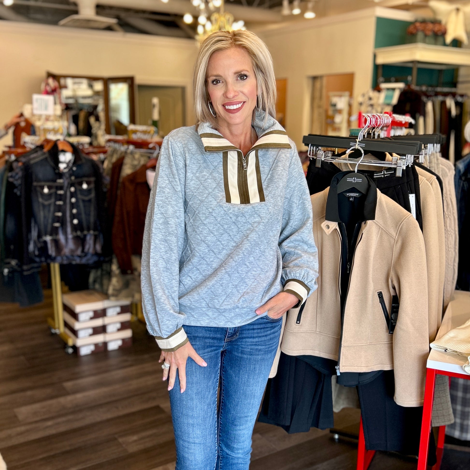 Add a cozy twist to your casual wardrobe with this light gray sweatshirt featuring a quilted texture that feels as good as it looks. The playful sueded accents in cream and olive at the 1/4 zip and sleeve cuffs bring a fun pop of color and softness, making it perfect for layering or lounging in style. Stay comfy and chic wherever you go! Sara is in the extra small. poly spandex blend.