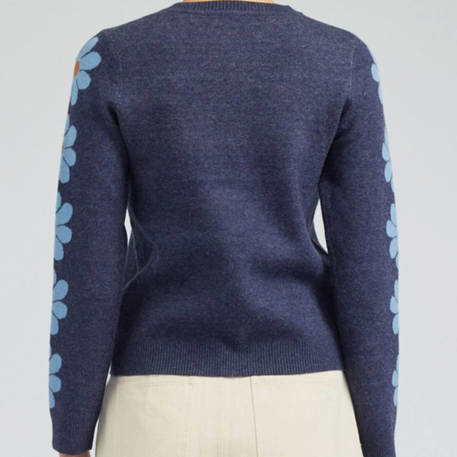 Cozy up in this charming long sleeve sweater top featuring a delicate floral pattern that blooms across the sleeves. The soft heather navy hue pairs perfectly with everything in your wardrobe, while the classic round neckline keeps things effortlessly chic. Whether you're layering for warmth or wearing it solo, this versatile piece brings a touch of botanical beauty to your everyday style. Perfect for those moments when you want comfort without compromising on character.