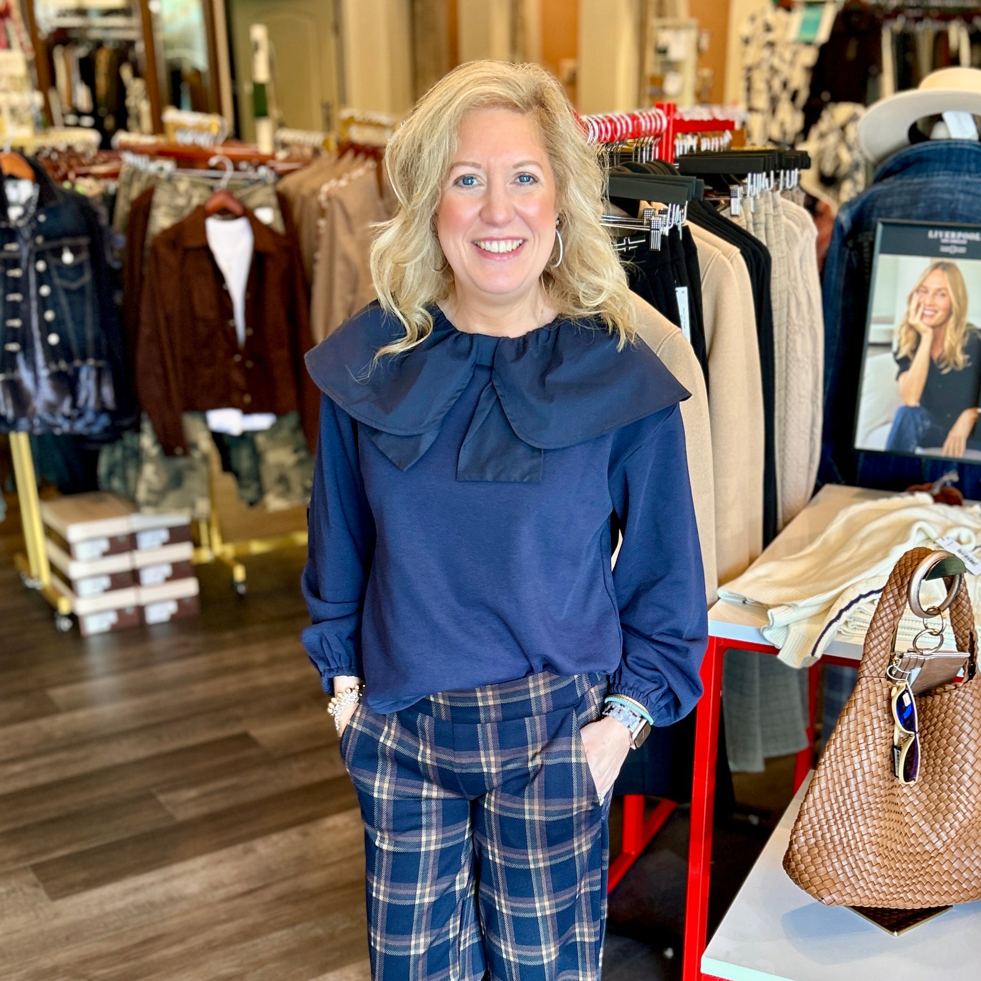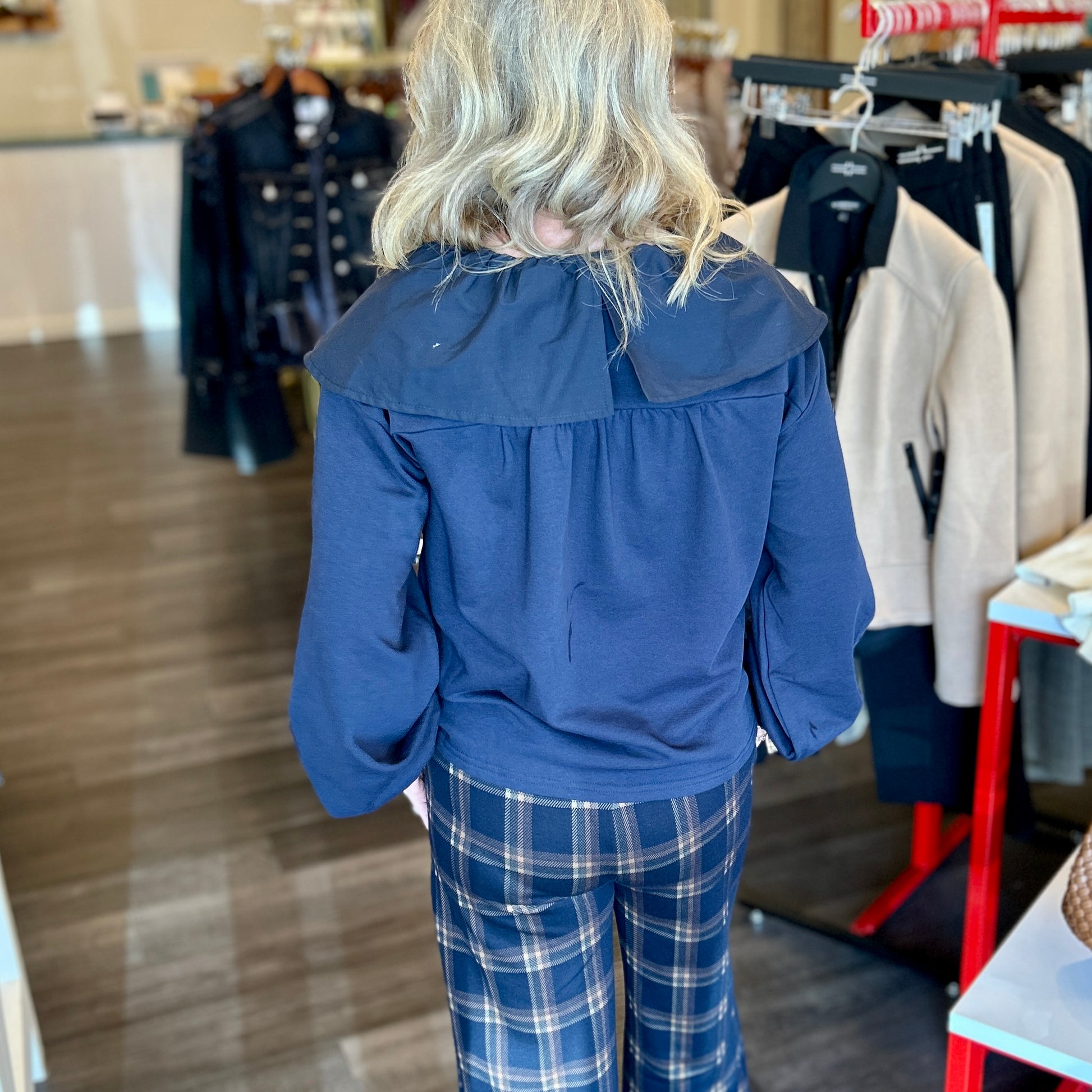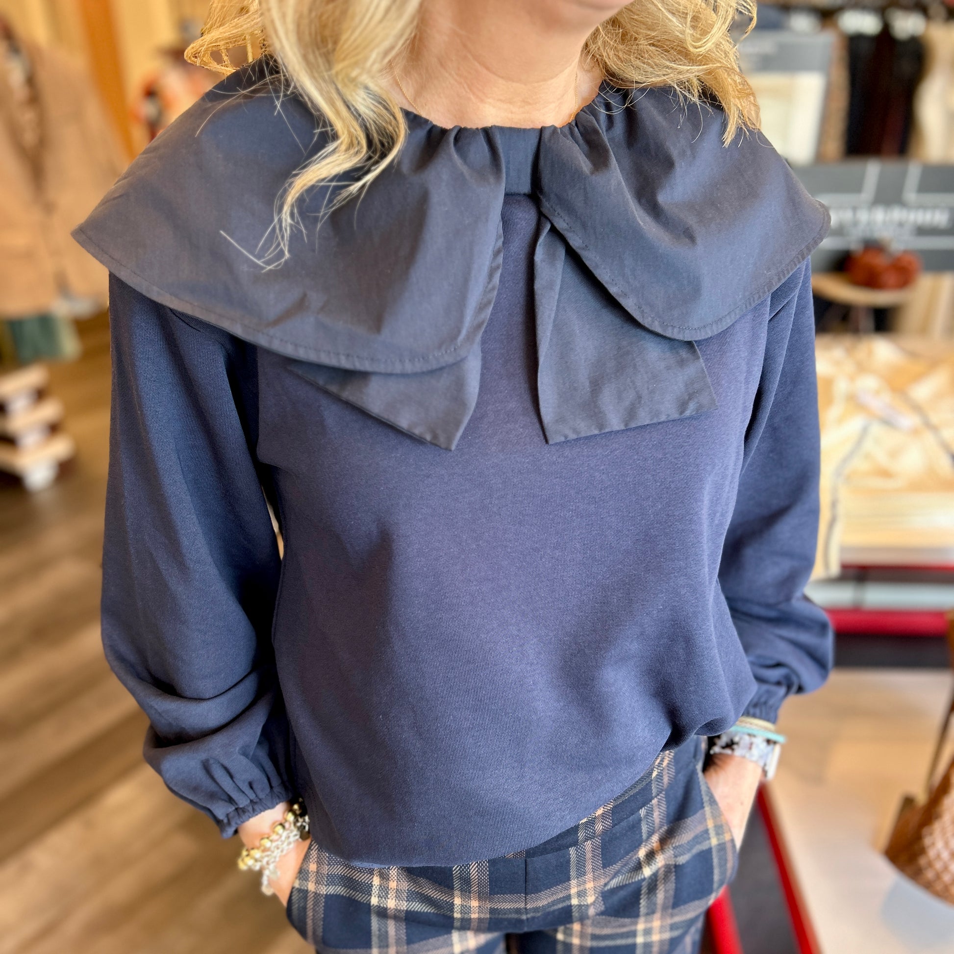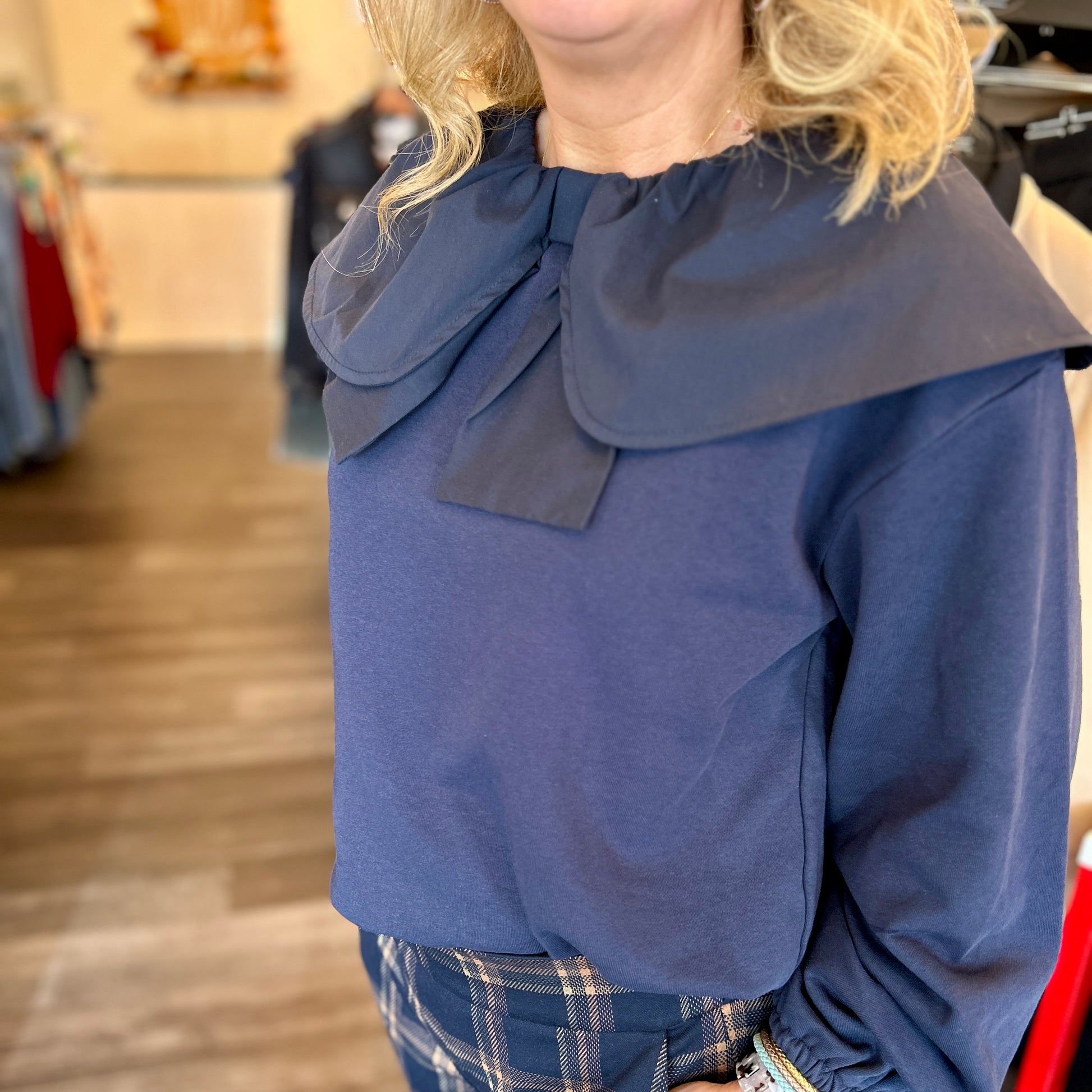 This navy French terry top brings a playful twist to your wardrobe with its charming balloon sleeves and a cute cotton bow accent at the neckline. Finished with a delicate button at the back, it combines comfort with a touch of flirty style that's perfect for casual days with a fun flair. Renee is in the small.