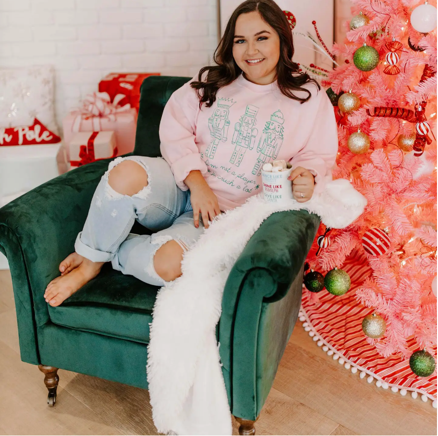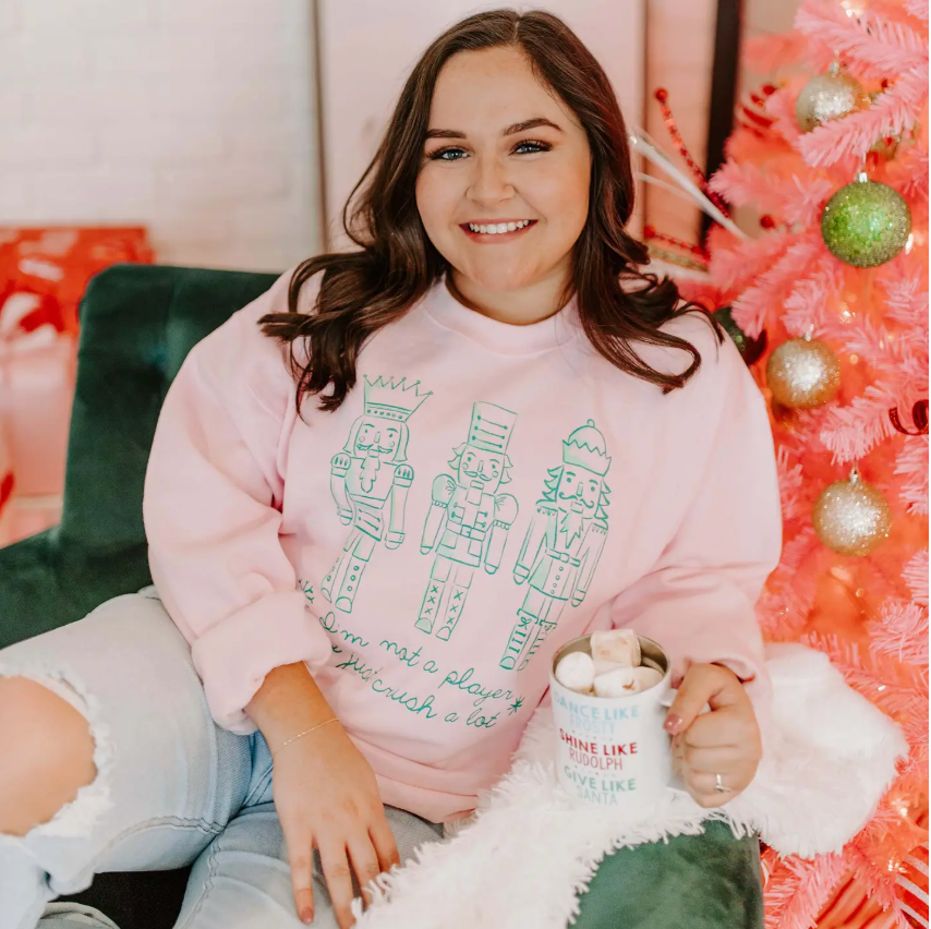 The perfect Nutcracker Sweatshirt doesn't exi...wait. yes it does! Meet your new funny and favorite holiday sweatshirt! Pink eith grean silkscreening. Script "I'm not a player I just crush a lot" underneath the three nutcrackers. Too cute and too funny.