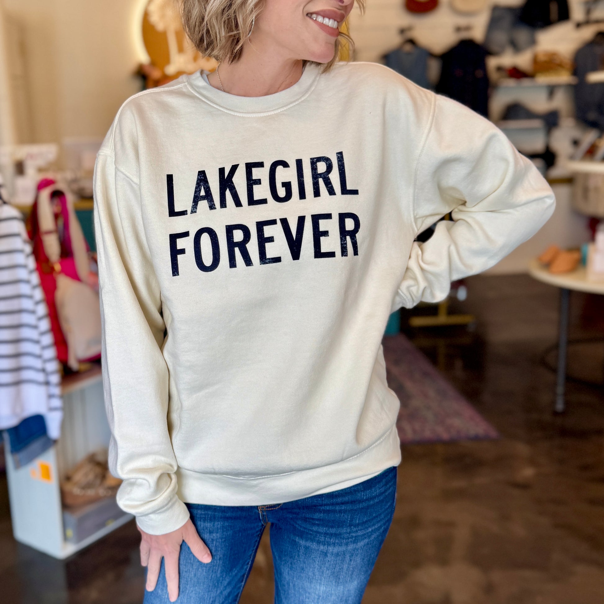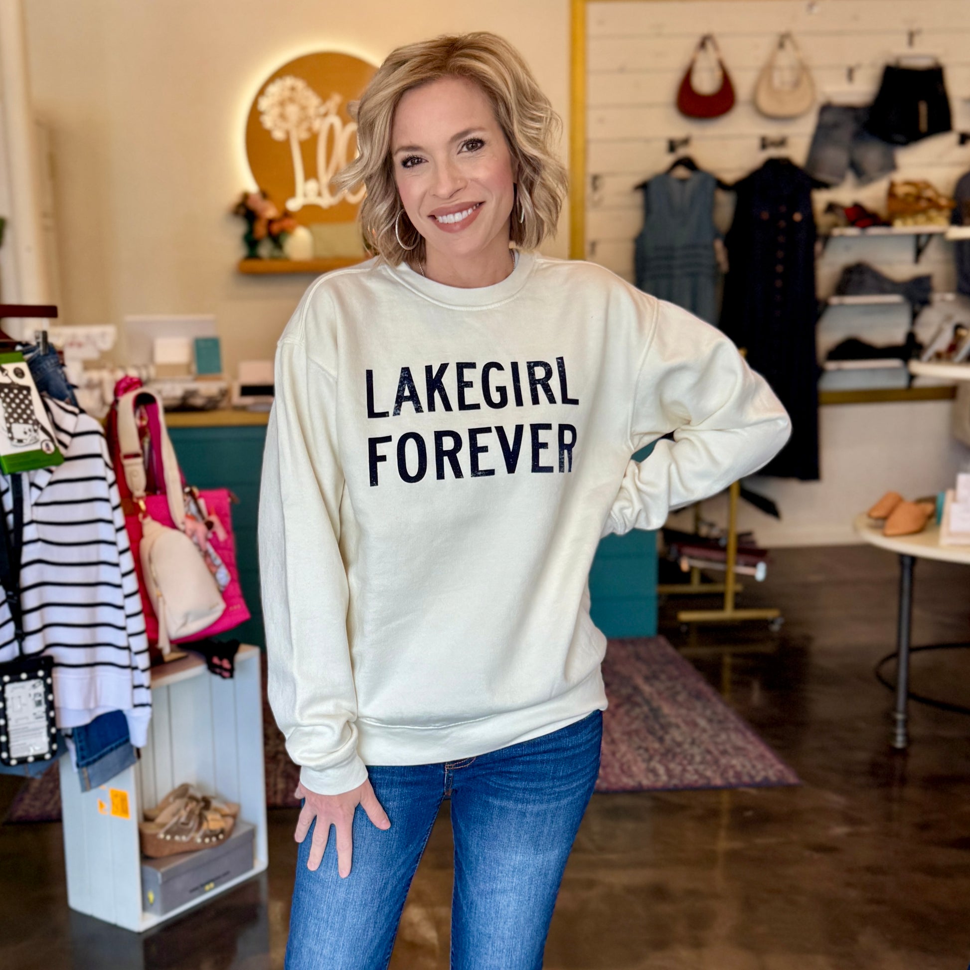 Get comfy and stay stylish with Lakegirl Forever! This ecru crewneck shirt features a playful navy print, offering a relaxed fit for all-day comfort. Sara loves rocking it in a small - you will too!