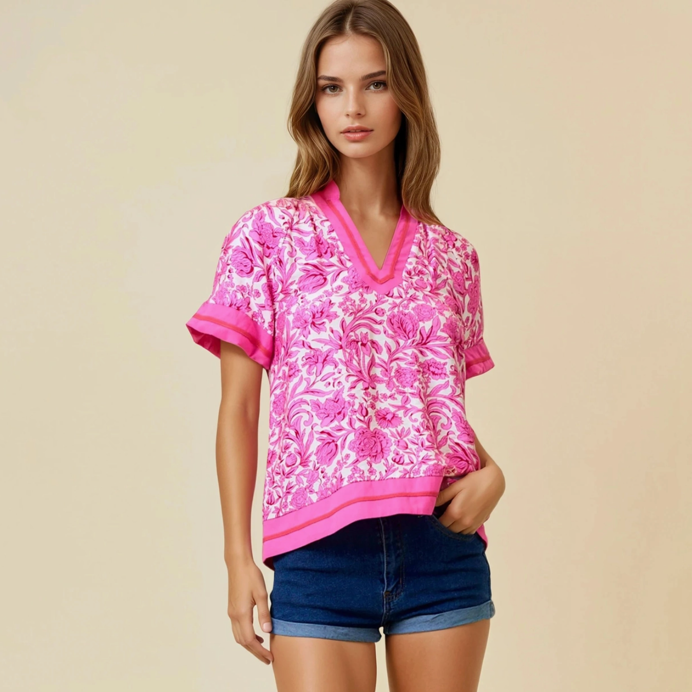 Floral printed ruffle tiered top • Allover floral print in bright contrast colors for a bold, feminine look • Soft woven fabric with a relaxed, boxy silhouette for easy, everyday wear • Split V neckline with solid contrast trim that frames the face • Short sleeves with contrast banded cuffs for a polished finish 𝐒𝐭𝐲𝐥𝐞 𝐦𝐞𝐚𝐬𝐮𝐫𝐞𝐦𝐞𝐧𝐭𝐬 (𝐒𝐢𝐳𝐞 𝐬𝐦𝐚𝐥𝐥) • Total length 25" • Bust 18 1/2" • Sleeve length 12 3/4" • Shoulder 13" 83%RAYON17%NYLON | CONT1/2:100%COTTON |LINING:100%POLY Model is 5'10" | Bust 33" | Waist 25" | Hips 36" wearing small