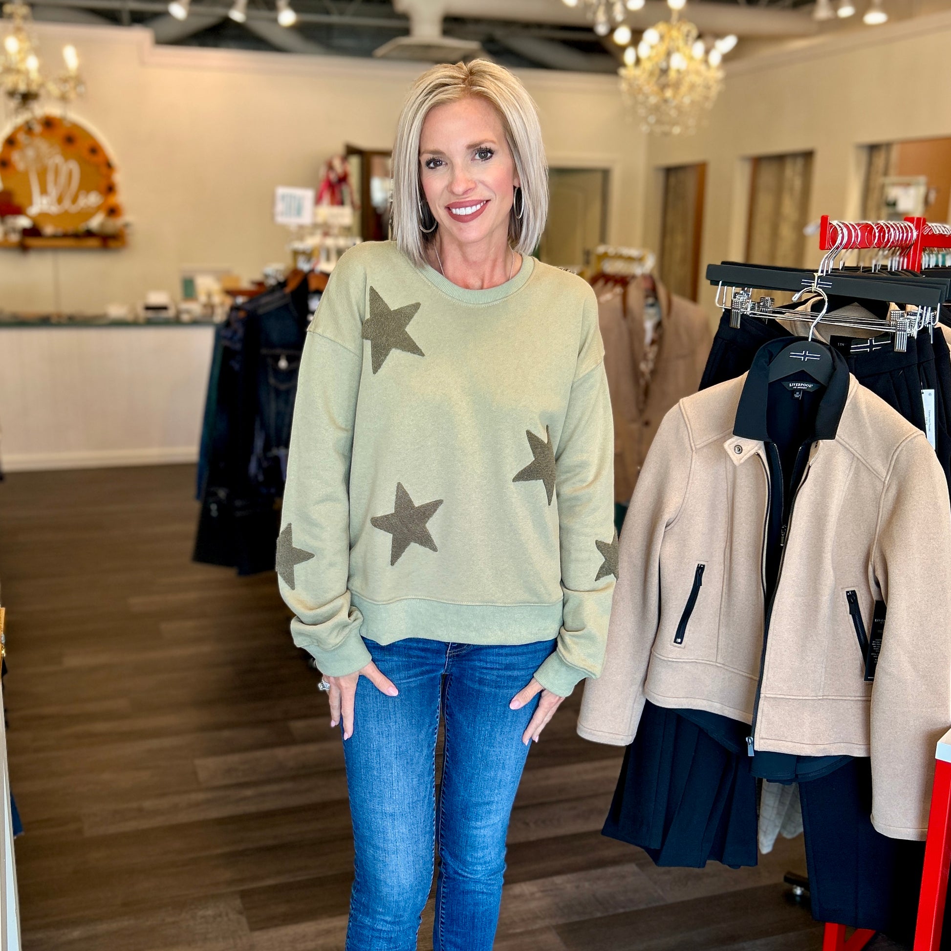 Stay cozy and stylish in the Sage Star Patch Sweatshirt. This playful piece features a soft French terry fabric with comfy drop shoulders, accented by charming terry boucle star patches. The banded bottom and sleeves add a snug finish, making it perfect for relaxed days with a fun twist. Sara is in the small.