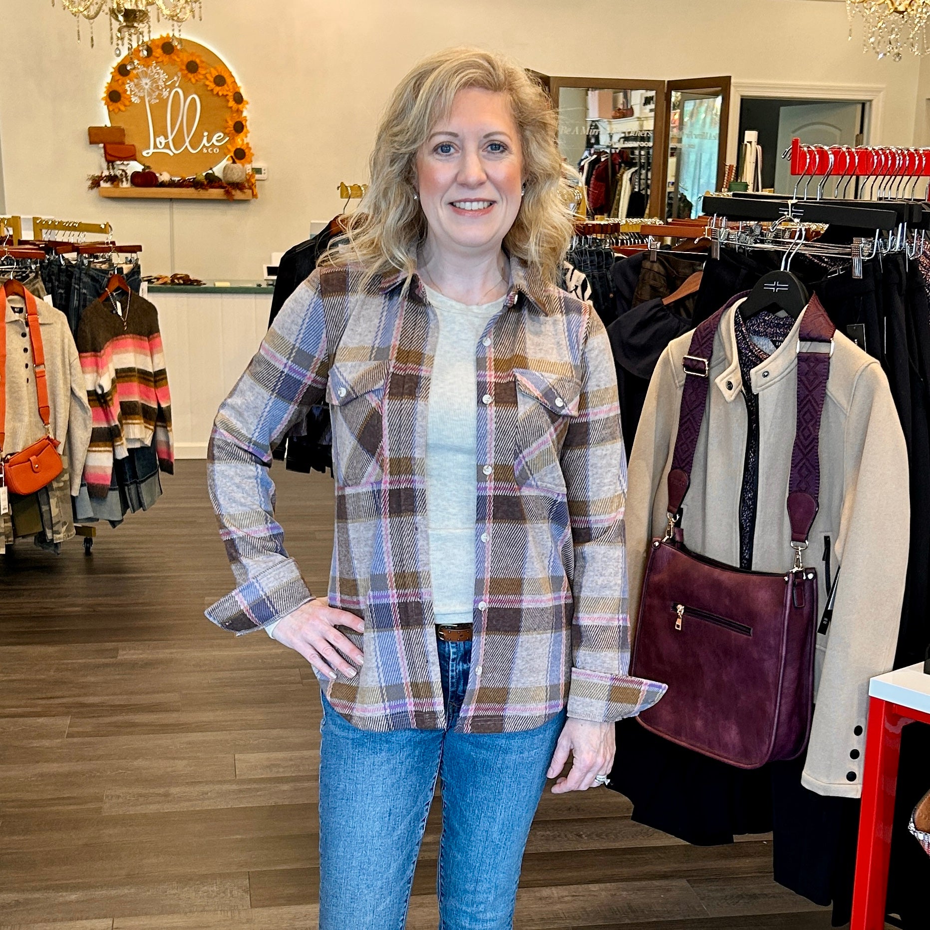 The Stacy Long Sleeve Tee is a cozy favorite made from a soft baby ribbed micro modal and spandex blend that hugs just right. Its high scoop neck and curved shirt tail hem add a fun twist to a classic look. In a heather oatmeal shade, this tee is perfect for layering or alone. Sara and Renee are in the extra small (which gave a more fitted silhouette for under the flannel) but recommends staying true to your normal size.