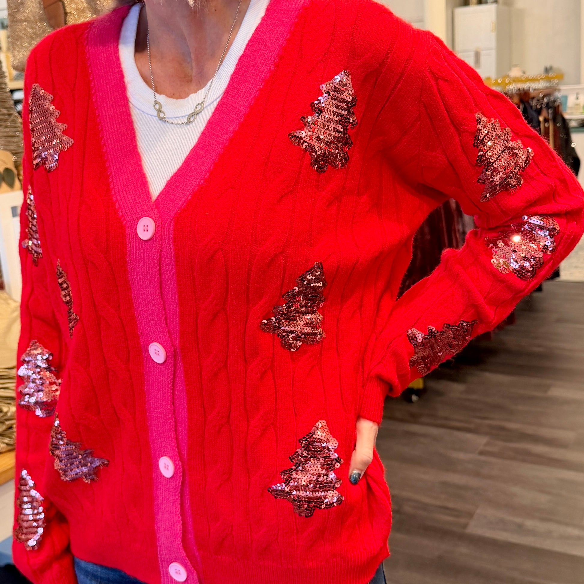 Spread holiday cheer in this festive cable knit cardigan featuring shimmering sequin trees that catch the light with every move. The rich red base pairs perfectly with charming pink trim and coordinating buttons for a look that's equal parts cozy and celebratory. Whether you're heading to a holiday party or keeping things casual, this playful piece brings instant seasonal sparkle to your wardrobe. Sara is wearing size S/M.