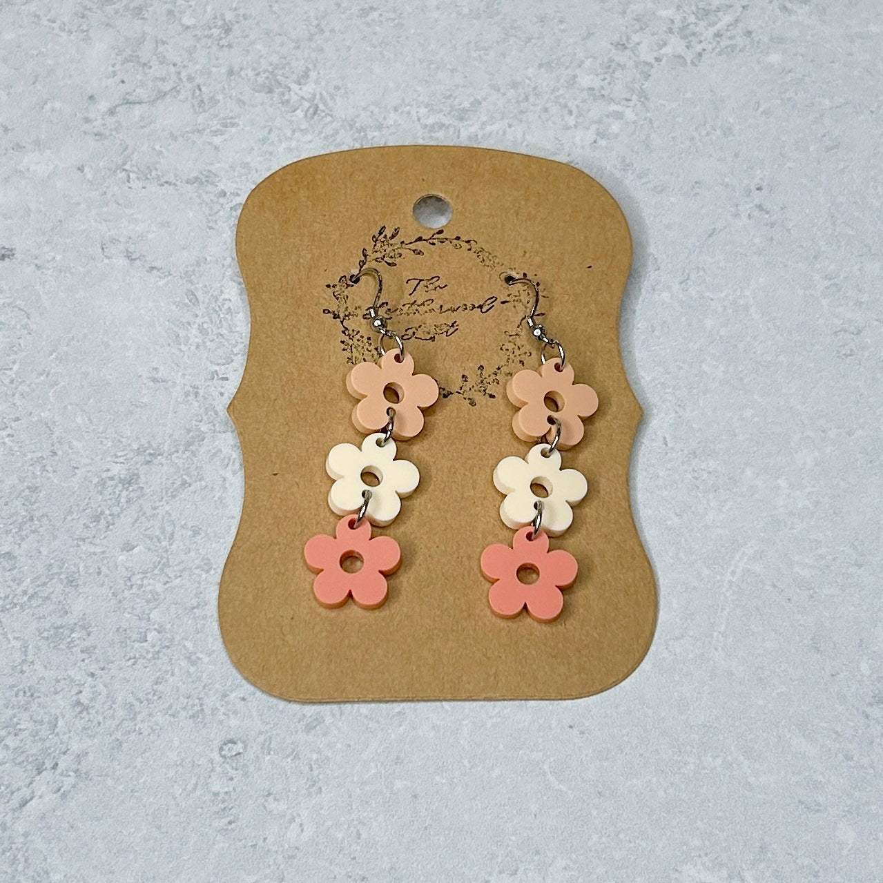 Delicate acrylic blooms cascade from your ears with these charming Triple Flower Dangle Earrings. Each pair features three dimensional flowers in soft peach, cream, and coral tones arranged in a graceful linear pattern. Lightweight and eye-catching, these statement earrings add a playful botanical touch to any outfit. Perfect for everyday wear or special occasions, they're designed to turn heads with their unique floral arrangement and warm, inviting color palette. Brought to you by The Leatherwood Loft