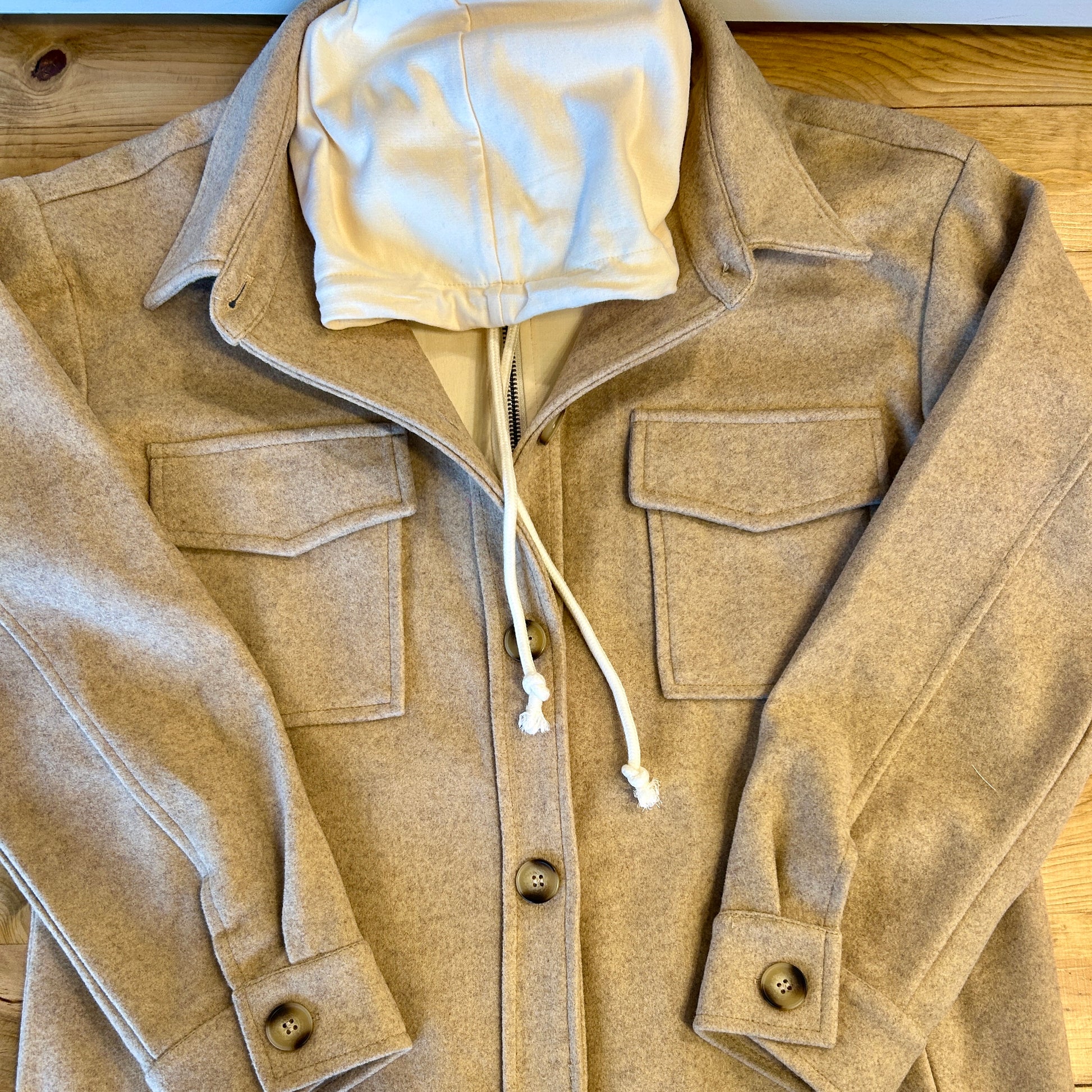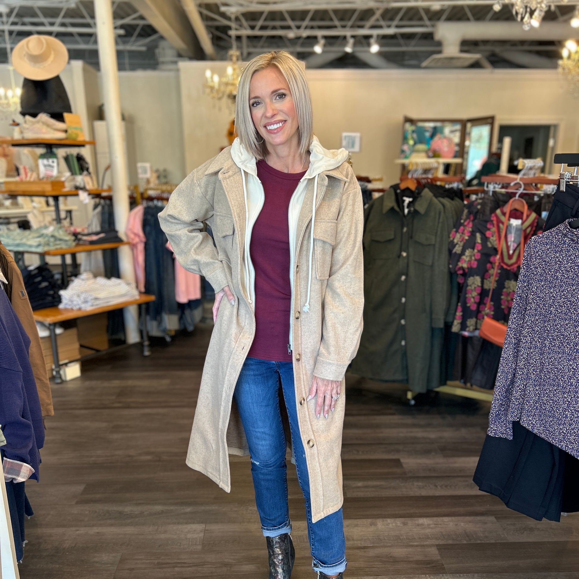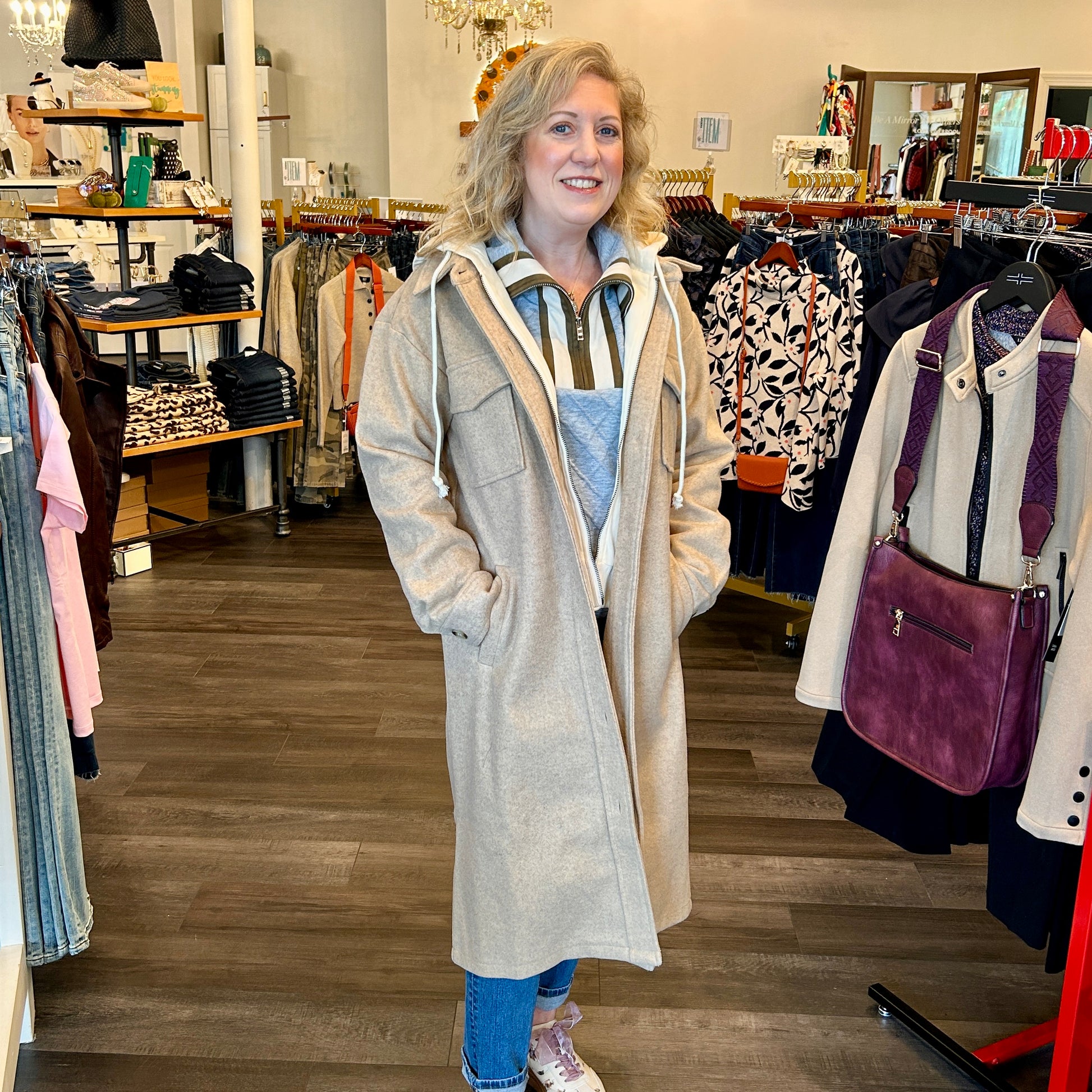 Stay cozy and stylish with the tan and cream Twofer Hoodie Coat, blending the smooth comfort of polyester and viscose with the casual charm of a faux cotton zip hoodie. This midi-length jacket buttons up for a polished look, while the attached hoodie adds a fun, layered vibe. Practical flap chest pockets and side hand pockets keep essentials close, making this piece perfect for playful days out or relaxed weekends. Renee is in the small.